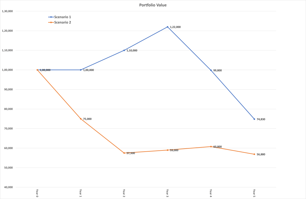 Unlike in the earlier table and graph where despite different paths both the scenarios resulted in the same portfolio value, here due to periodic withdrawals and sequence of returns, the portfolio end values are significantly different (in these scenarios almost 30% difference).