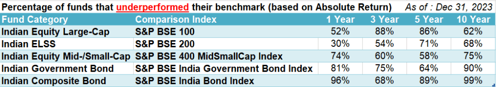 For instance, did you know that over half (52%) of Indian Equity Large-Cap funds could not beat the S&P BSE 100 index in 2023? The underperformance rates paint a grimmer picture over three- and five-year periods, making a home run at 88% and 86%, respectively.